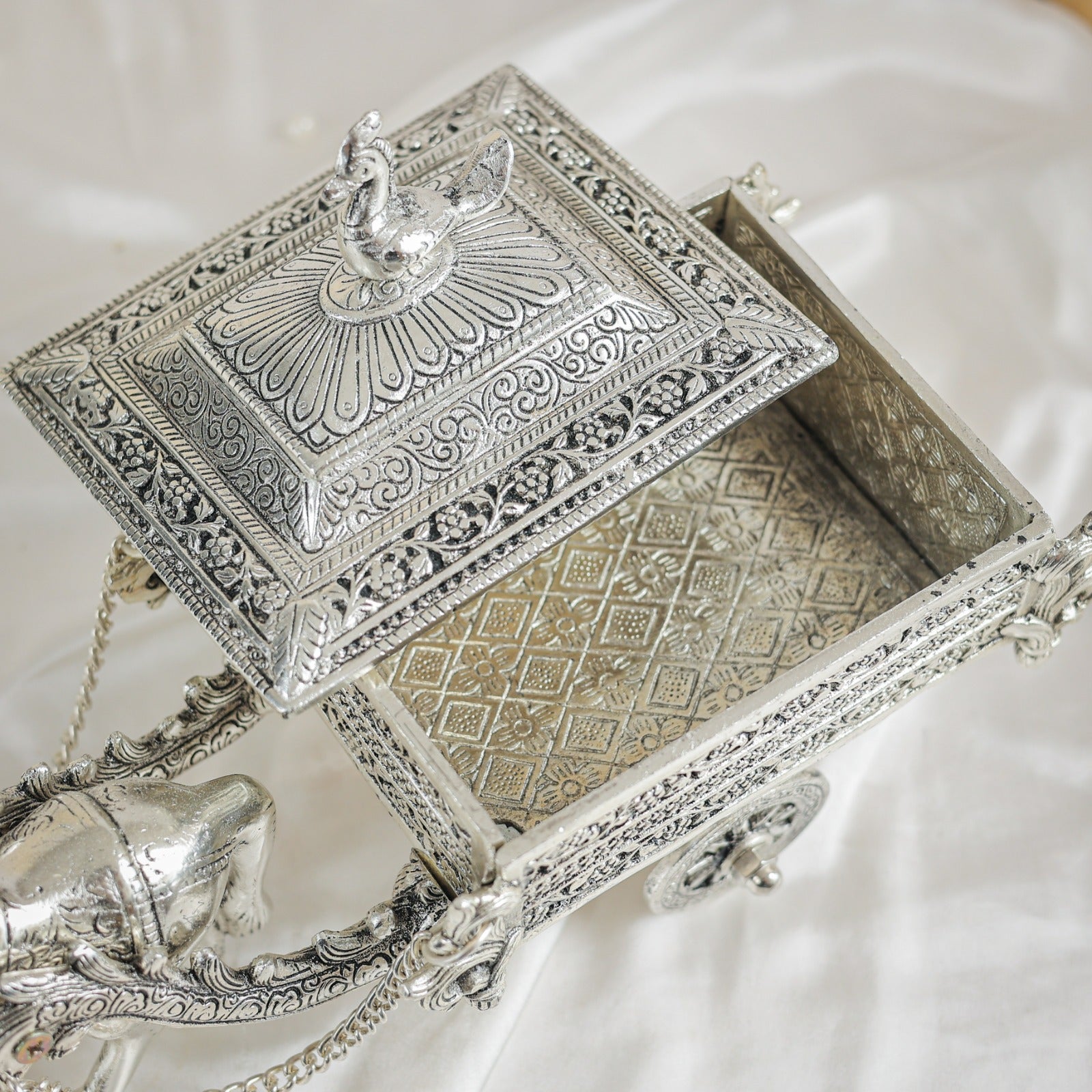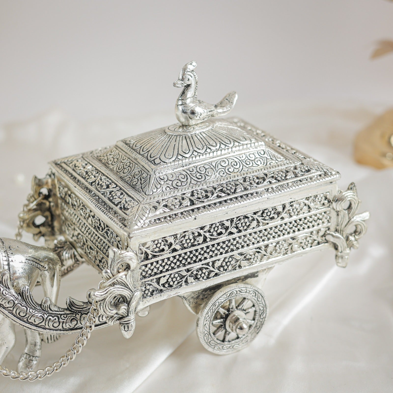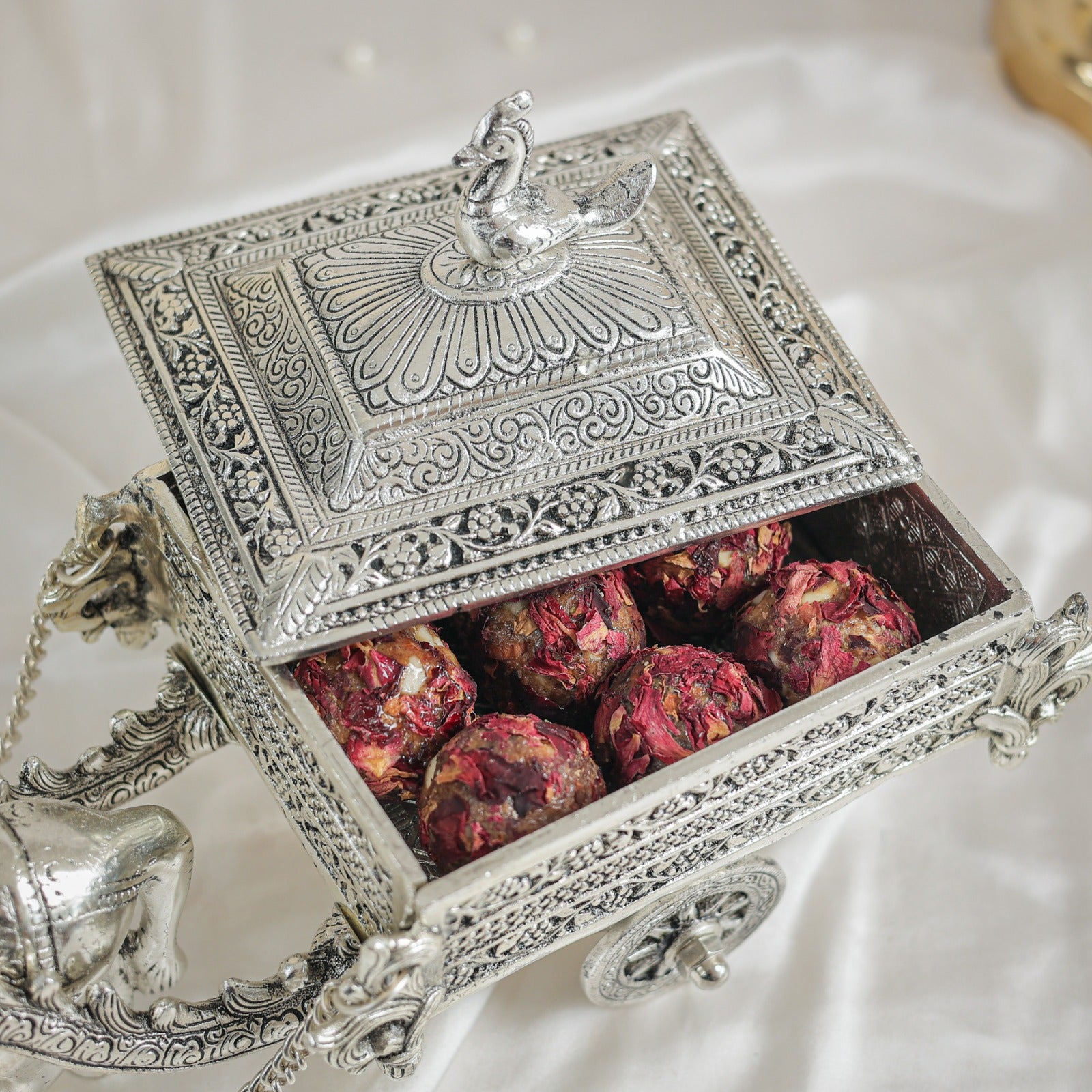 - Silver Chariot Box – Intricately designed carriage with jaali and floral embossed detailing.